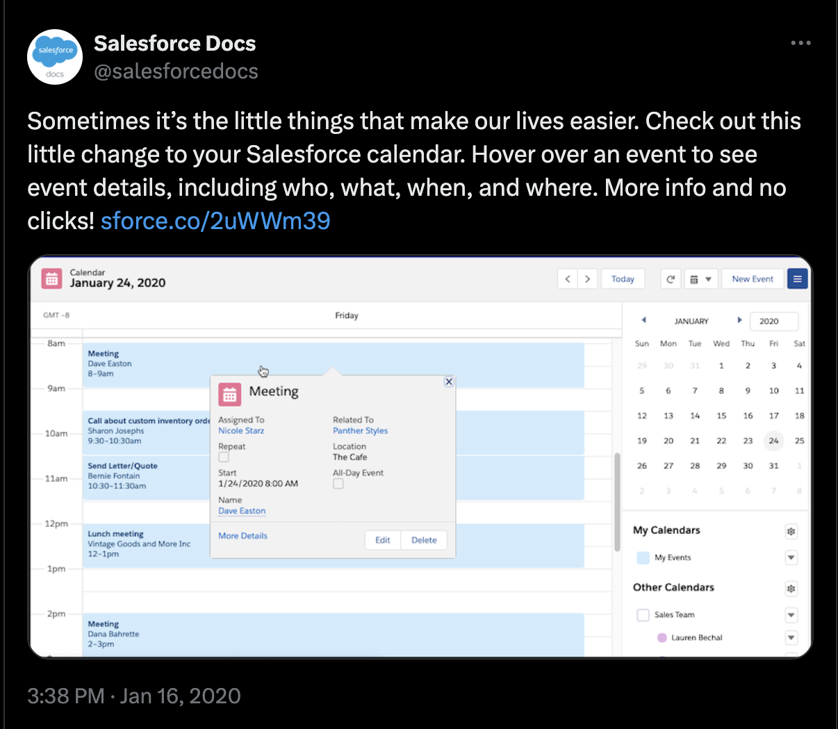 This tweet highlights a small yet impactful change in the Salesforce Calendar interface. Users can now hover over events to view details such as participants, event description, time, and location without the need for additional clicks. This enhancement streamlines the user experience by providing instant access to crucial information, making scheduling and event management more efficient.